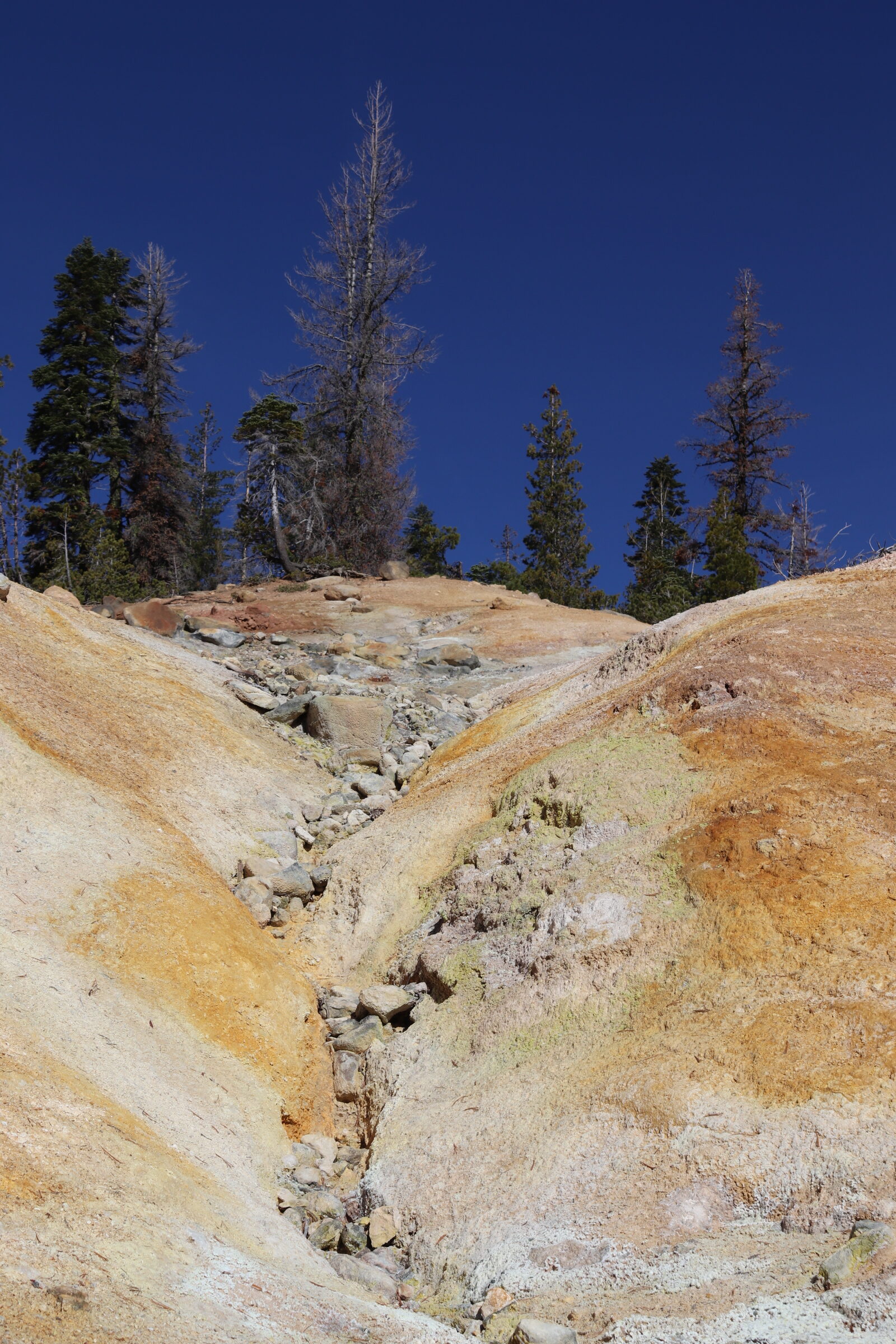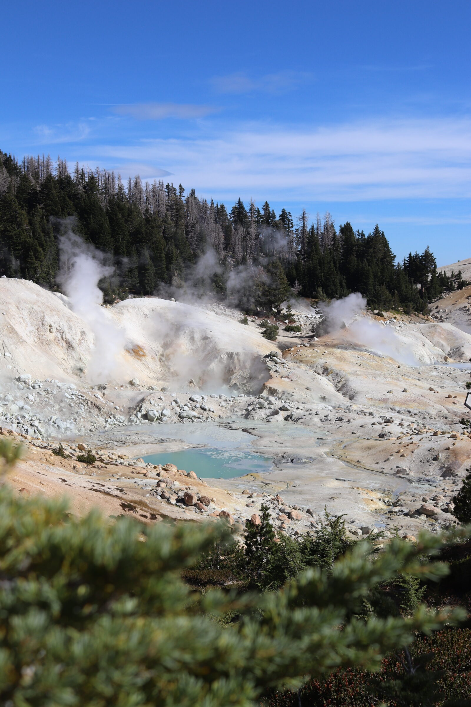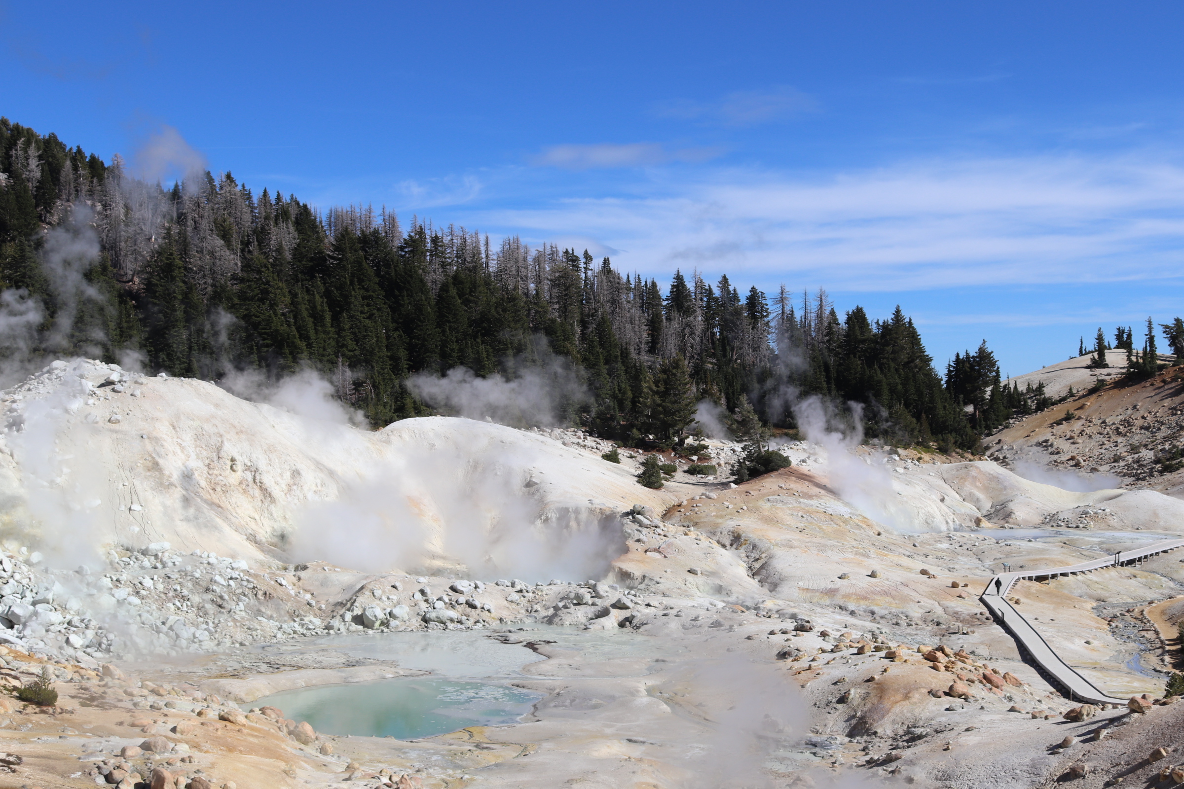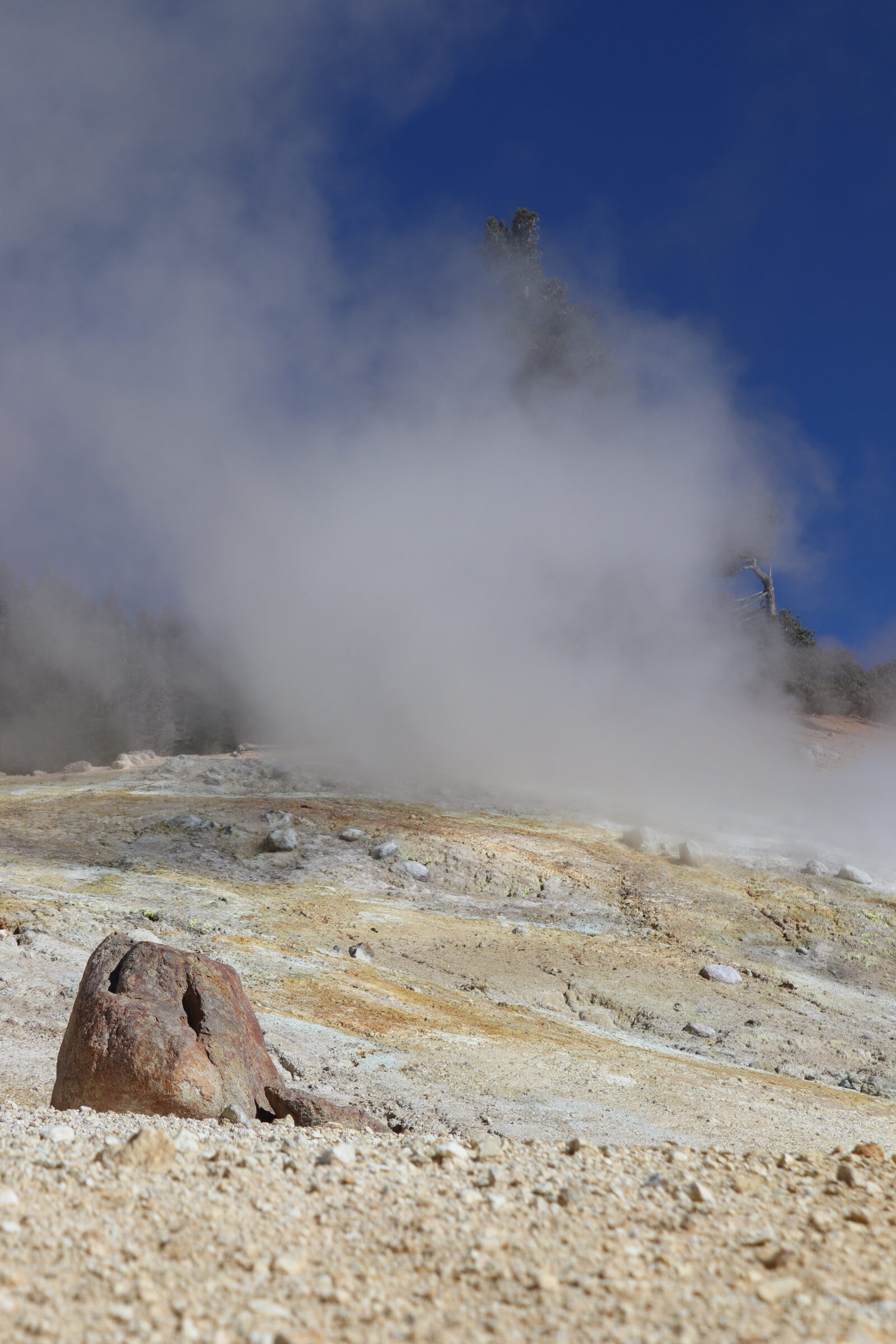 La prima tappa che si incontra, entrando da sud, è la zona di Sulphur Works, una delle aree geotermali più accessibili del parco. Subito, ci colpisce la consapevolezza che il Lassen è un territorio “vivo”: il terreno mormora, il fango ribolle e dall’acqua calda del Sulphur Creek si solleva un vapore che porta con sé l’odore pungente dello zolfo. I colori ocra, gialli, rossi e occasionalmente verdi del terreno, dovuti all’acidità, alla presenza di ossidi di ferro e alla proliferazione di batteri termofili, creano un contrasto spettacolare con il verde delle foreste circostanti.