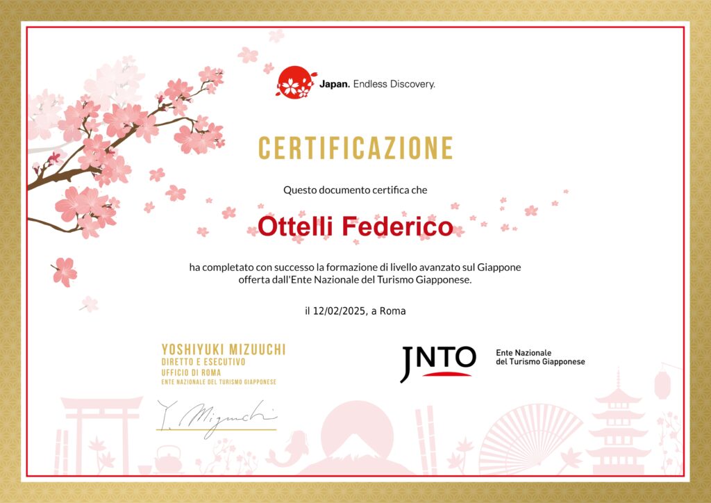 Questo attestato è la testimonianza del nostro impegno nell’unire l’eredità culturale giapponese a un approccio moderno e creativo, capace di trasformare ogni esperienza di viaggio in un percorso unico e autentico.