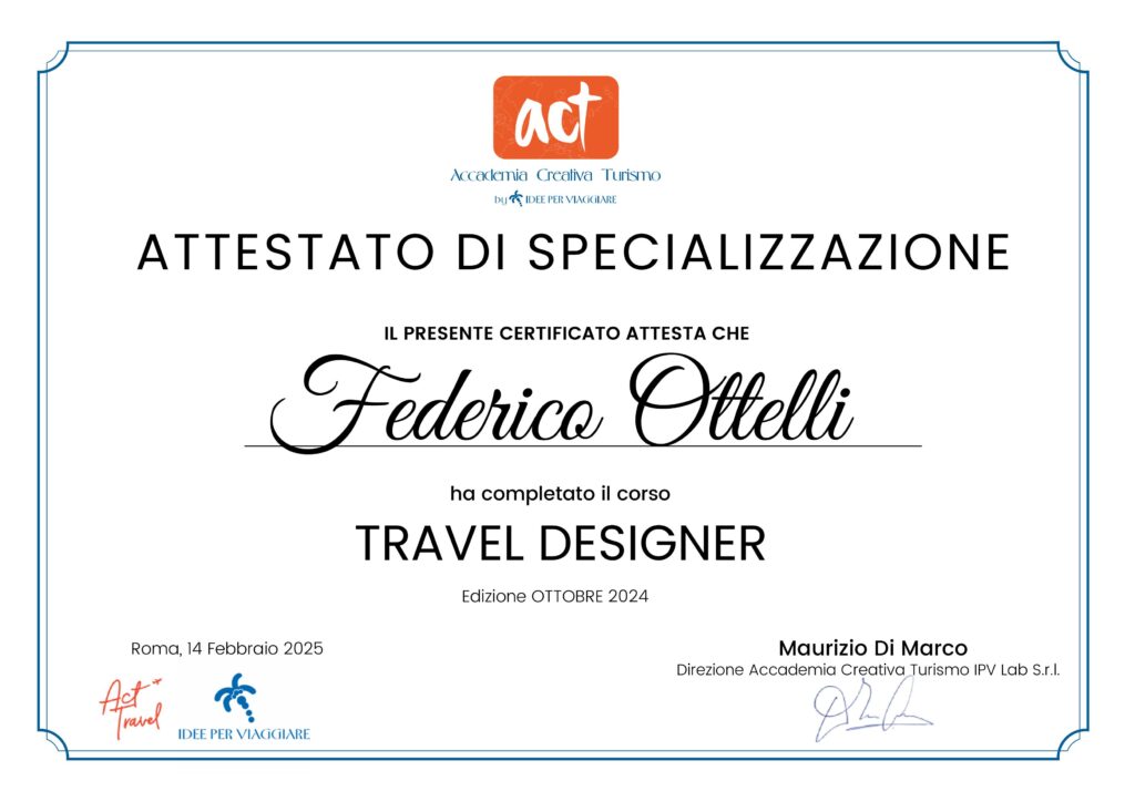 Affidarsi a un professionista del viaggio significa scegliere qualità, competenza e sicurezza. Le nostre certificazioni sono la garanzia che ogni esperienza che creiamo per te è progettata con il massimo della professionalità e attenzione ai dettagli. Scopri i riconoscimenti che ci permettono di offrirti viaggi unici, su misura e con il supporto di partner di fiducia.